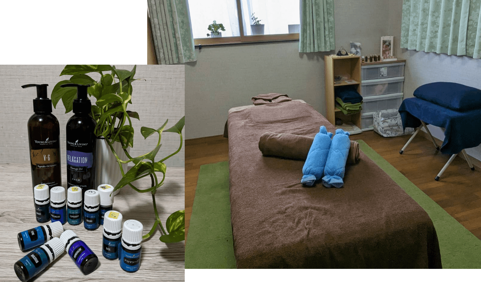 新潟市秋葉区にある家の1室を使ったプライベートサロンです。アロマの香りに包まれ疲れた身体をほぐし癒やします。最高級品質のエッセンシャルオイルを背骨に垂らし背骨に溜まったネガティブな感情のエネルギーを開放します。